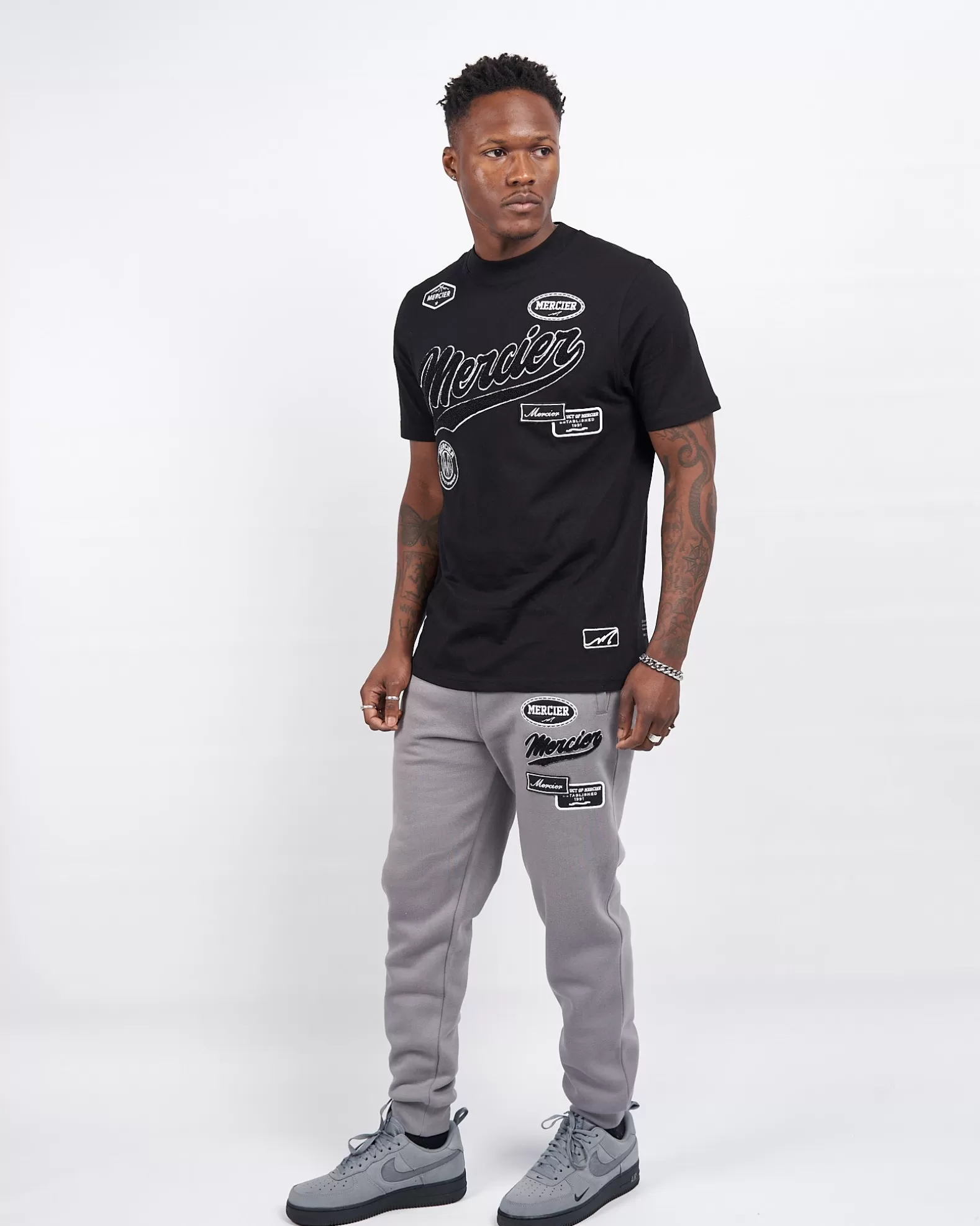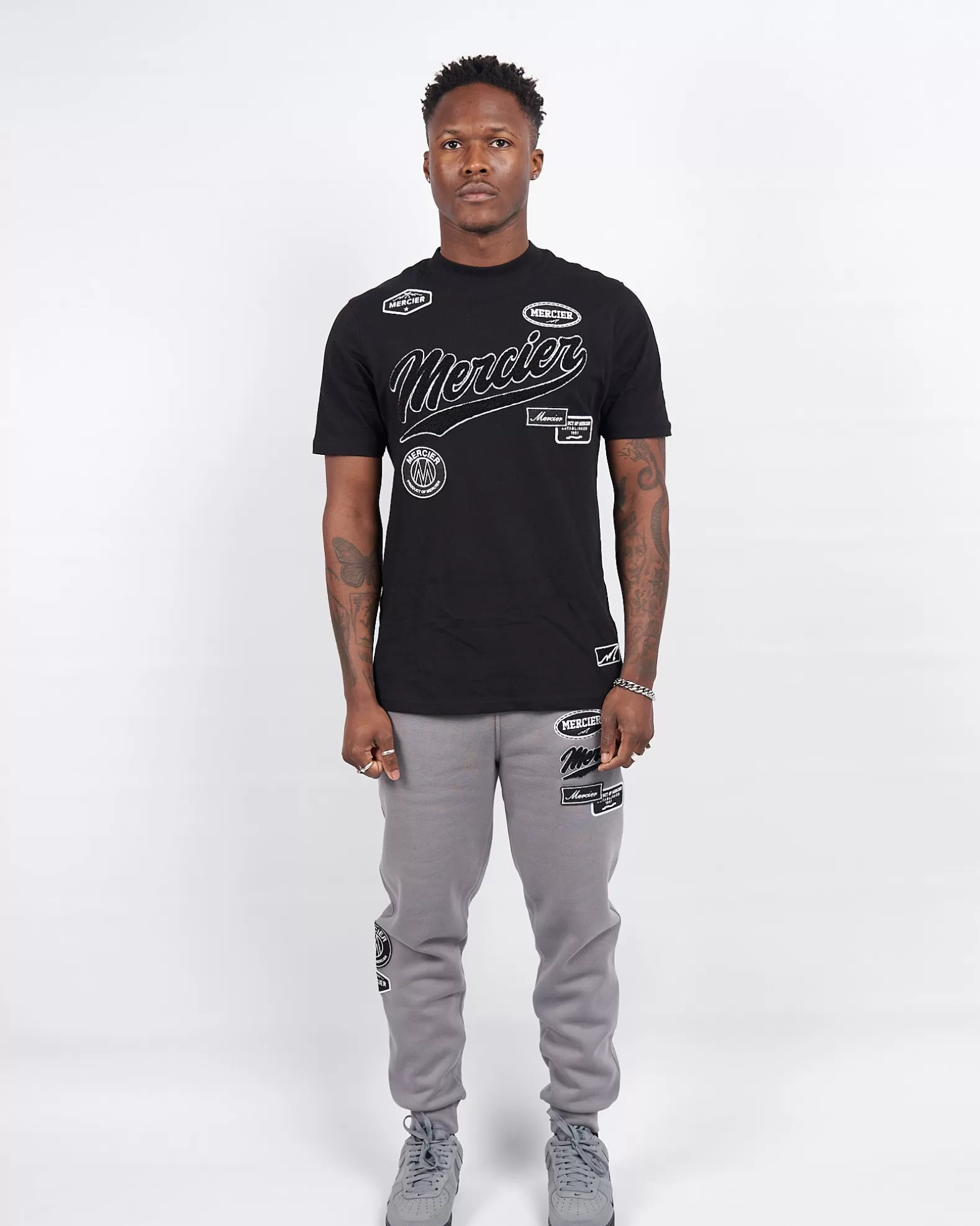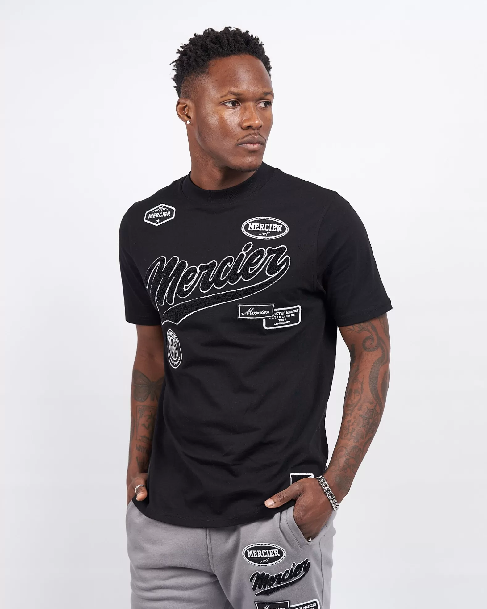 Black Mercier Teams Tshirt Model is 5'9ft and wears M Regular fit Wash on 30c, do not tumble dry 220 gsm brushback cotton Chenille branding on the front