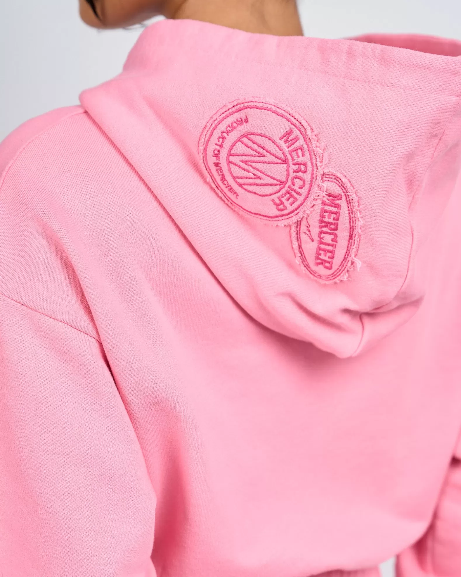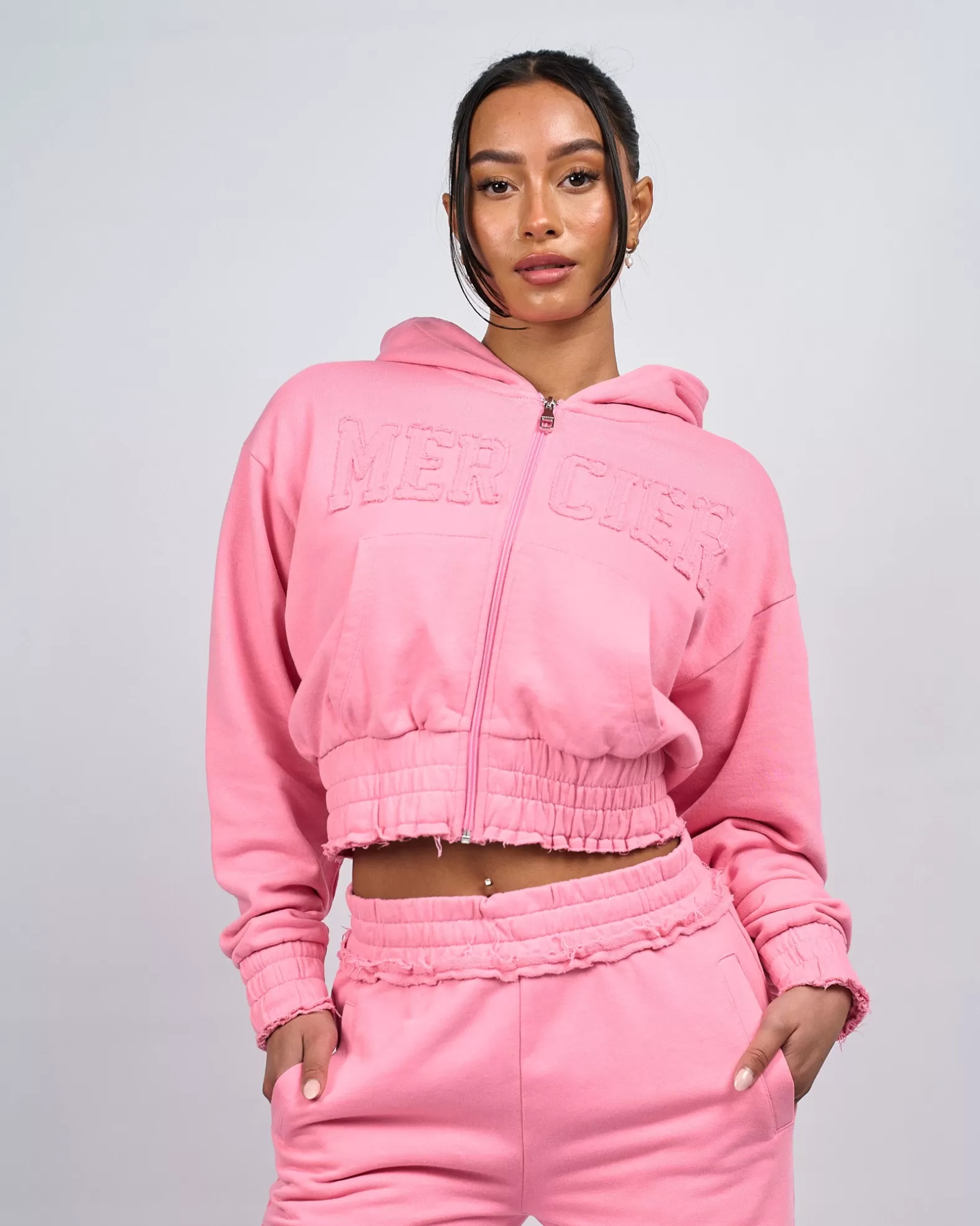 Women's Pink Mercier Distressed Cropped Hoodie Model is 5"3 and wears XS Relaxed cropped fit Do not tumble dry Tonal embroidered front branding detail with raw distressed finish Tonal embroidered badges on hood Raw edge gathered waistband 315gsm loopback cotton Complete the look with Women's Pink Mercier Distressed Jo