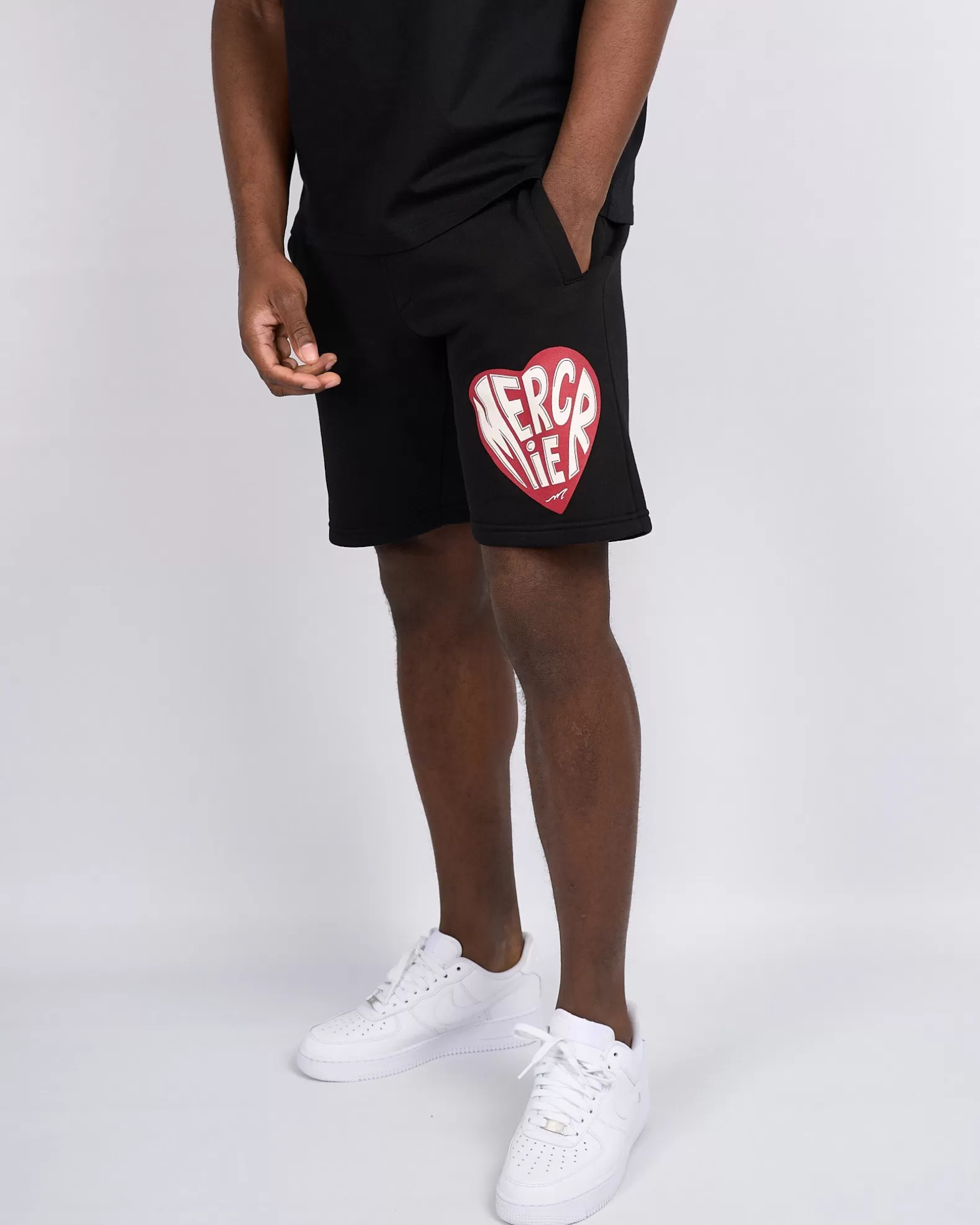 Black Mercier Heart Shorts Model is 6ft and wears M 315gsm brushback cotton Relaxed Fit Mercier Heart Branding front left leg Complete the look with Black Mercier Heart Tshirt