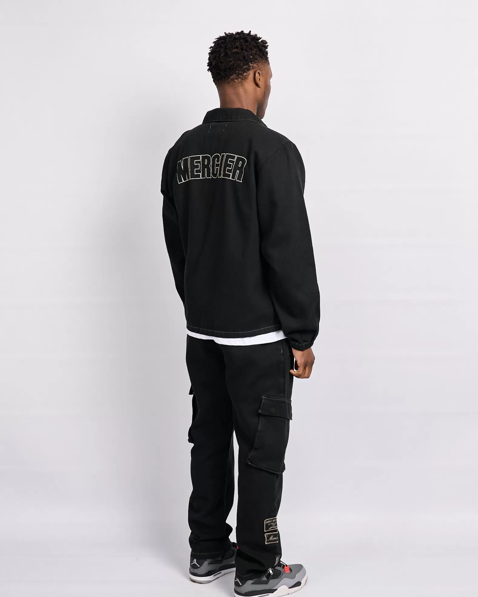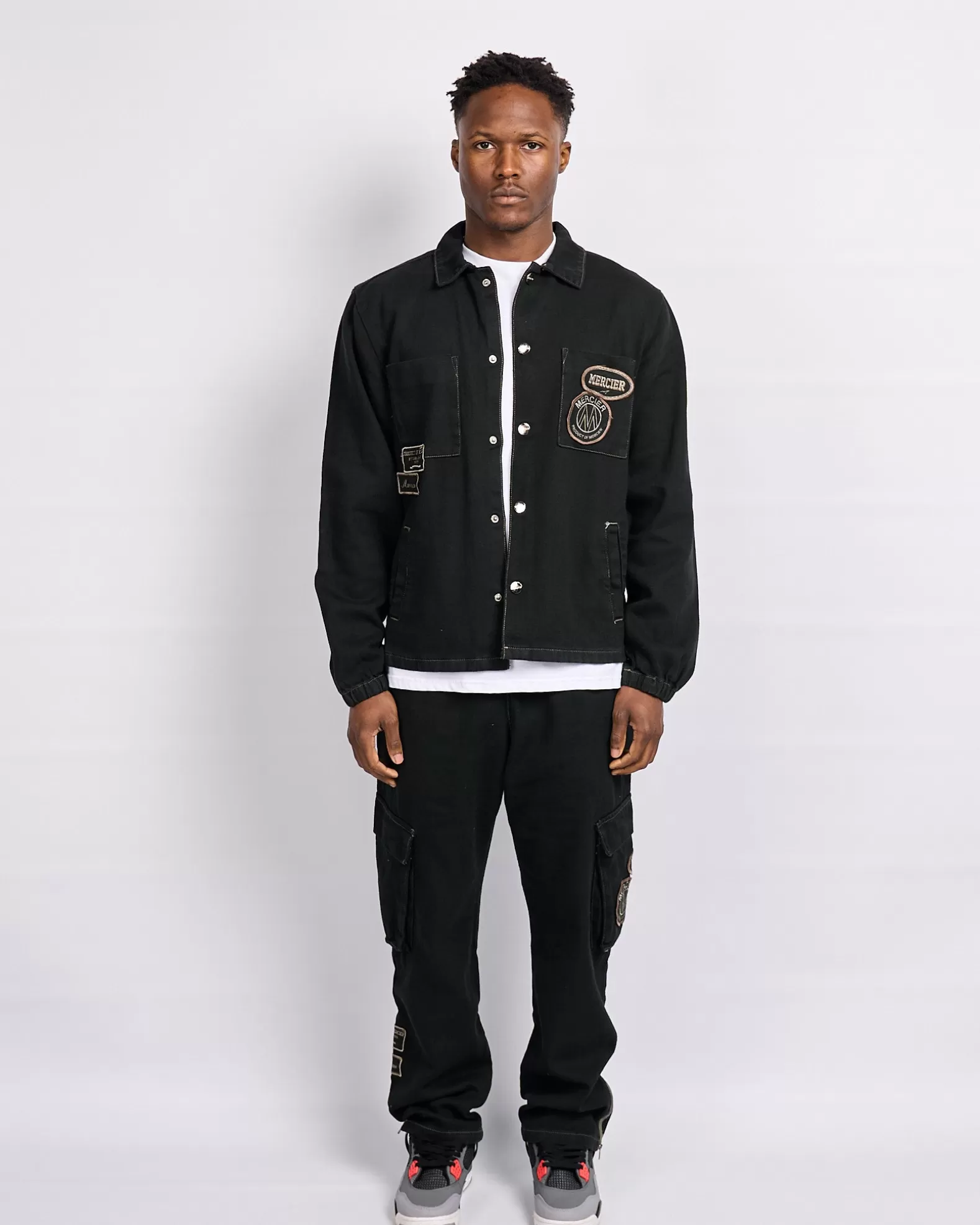 Black Mercier Daulton denim distressed Pants Model is 5'9ft and wears M Relaxed Fit distressed denim. Open Zip Fastening On The Ankle Branding to the left leg wide pocket Elasticated waistband Zip fastening OG badges