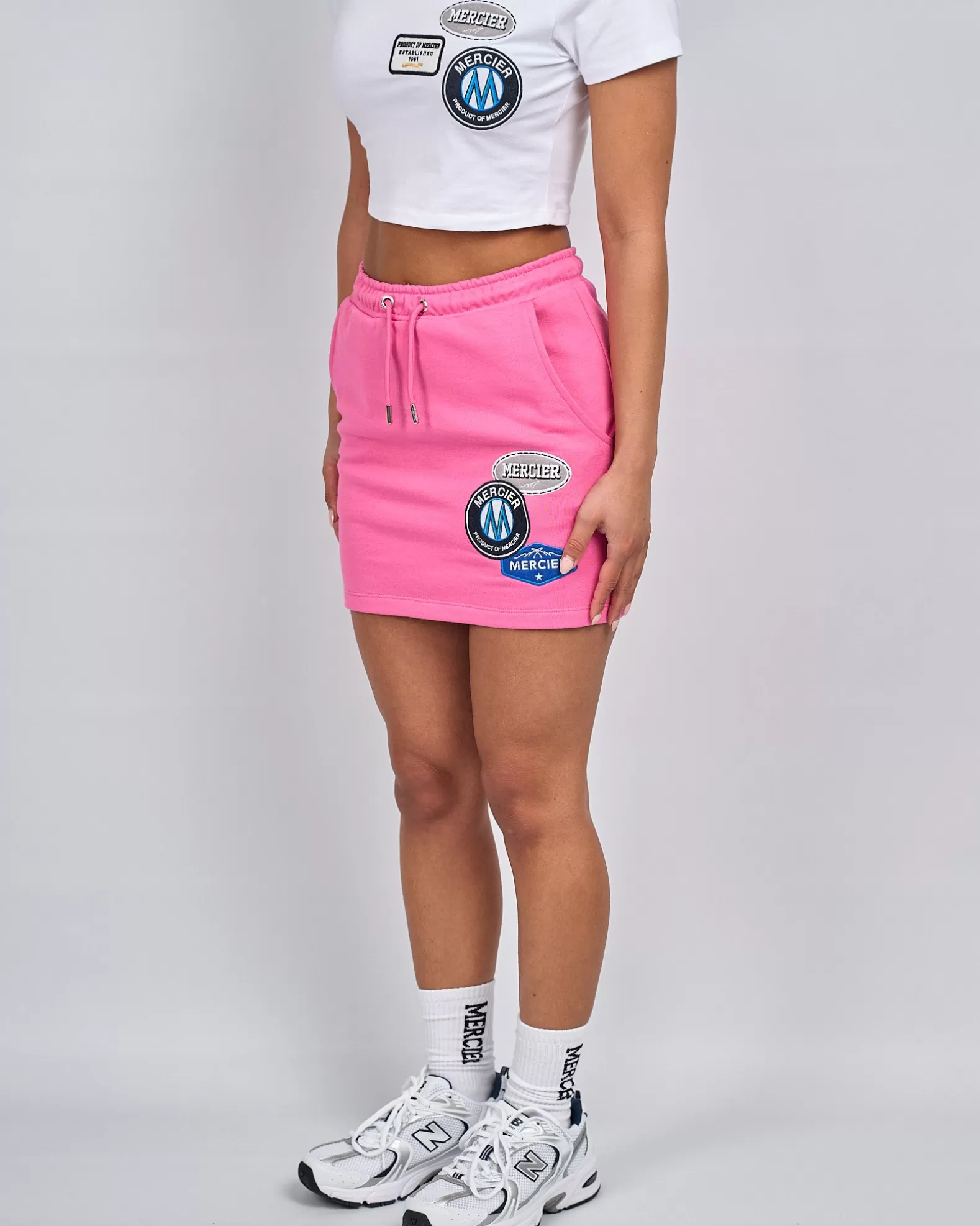 Womens Strawberry Moon Mercier OG Badge Mini Skirt Model is 5"3 and wears XS Mercier OG Badge detail on left leg 65% Cotton 35% Polyester Complete the look with Womens White Mercier OG Badge Cropped Baby Tshirt