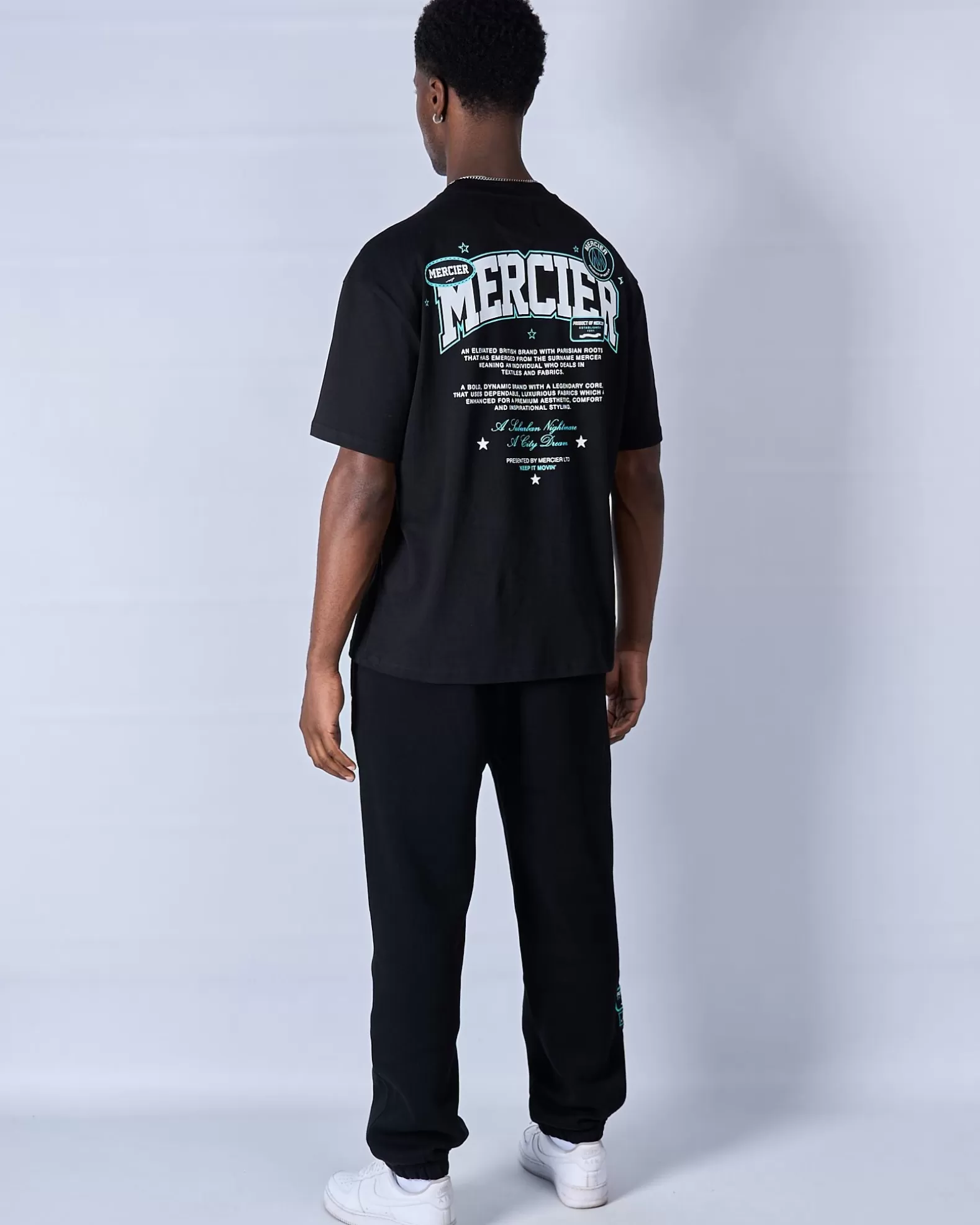 Black Mercier Origins Jogger Mercier Print Branding on left thigh and OG embroidered badge OG Badges on the bottom of the right leg Relaxed Fit Ruched Cuff Brushback Cotton