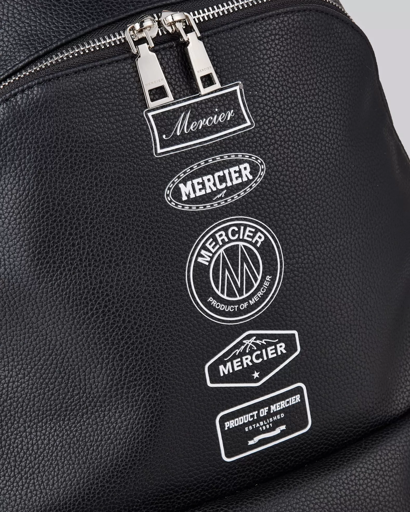 Mercier Premium Backpack Vegan Leather Printed 2:0 badges Brushed chrome metalwork detailing Measurements Height = 42cm Width = 30cm Depth = 20cm